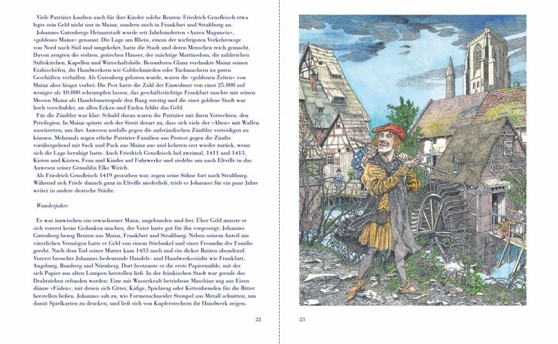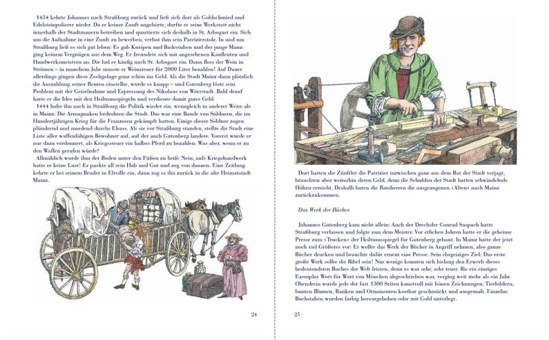 Um 1450 veränderte eine Erfindung die Welt für immer: Der Buchdruck mit beweglichen Lettern. Gutenbergs Werk der Bücher läutete ein neues Zeitalter ein! Das geschriebene Wort war nicht mehr länger nur den Reichen vorbehalten. Endlich war es möglich, Neuigkeiten und Gedanken, Ideen undWorte, vor allem aber Wissen unter die Leute zu bringen - eine Veränderung so bedeutend, wie die Erfindung des Computers oder des Internets.Die Autorin Christine Schulz-Reiss erzählt informativ und lebendig die Geschichte, wie aus dem hitzköpfigen Sohn eines Patriziers einer der bedeutendsten Erfinder der Weltgeschichte wurde.Klaus Ensikats meisterhafte Illustrationen versetzen sowohl kleine als auch große Leser zurück in die turbulente Zeit des Mittelalters und mitten in die Werkstatt von Johannes Gutenberg.