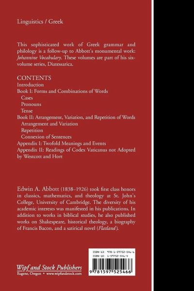 This sophisticated work of Greek grammar and philology is a follow-up to Abbott's monumental work: Johannine Vocabulary. These volumes are part of his six-volume series, Diatessarica. CONTENTS Introduction Book I: Forms and Combinations of Words Cases Pronouns Tense Book II: Arrangement, Variation, and Repetition of Words Arrangement and Variation Repetition Connexion of Sentences Appendix I: Twofold Meanings and Events Appendix II: Readings of Codex Vaticanus not Adopted by Westcott and Hort