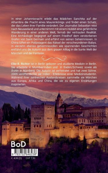 In einer Johannisnacht erlebt das Mädchen Sanchita auf der Alhambra die Pracht eines Maurenkönigs und findet einen Schatz, der das Leben ihrer Familie verändert. Der Journalist Sebastian reist nach Neuseeland und unternimmt mit einem Hobbit eine gefährliche Wanderung in einer anderen Welt, fernab der vertrauten Realität. Eine Archäologin begegnet auf einem Friedhof dem verstorbenen Grafen von Saint Germain und erfährt von seinen Geheimnissen. In China lüftet ein Polizeiagent das Rätsel der verschwundenen Babys. In vierzehn ebenso geheimnisvollen wie spannenden Geschichten entführt uns die Autorin aus dem grauen Alltag in die bunte Welt der Märchen und der Fantasie.
