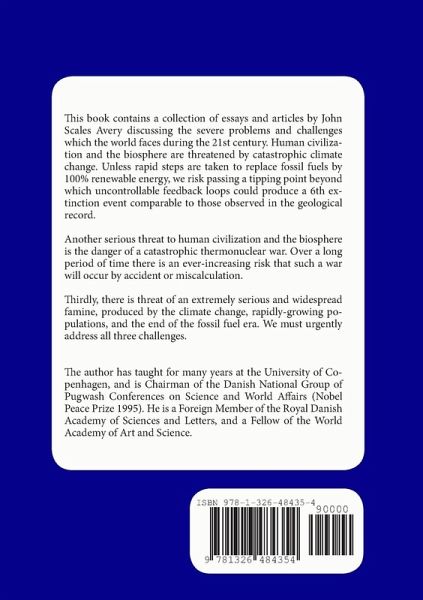 This book contains a collection of essays and articles by John Scales Avery discussing the severe problems and challenges which the world faces during the 21st century. Human civilization and the biosphere are threatened by catastrophic climate change. Unless rapid steps are taken to replace fossil fuels by 100% renewable energy, we risk passing a tipping point beyond which uncontrollable feedback loops could produce a 6th extinction event comparable to those observed in the geological record. Another serious threat to human civilization and the biosphere is the danger of a catastrophic thermonuclear war. Over a long period of time there is an ever-increasing risk that such a war will occur by accident or miscalculation. Thirdly, there is threat of an extremely serious and widespread famine, produced by the climate change, rapidly-growing populations, and the end of the fossil fuel era. We must urgently address all three challenges.