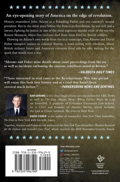 Look for Dan Abrams and David Fisher's new book, Kennedy's Avenger: Assassination, Conspiracy, and the Forgotten Trial of Jack Ruby. *NOW A NEW YORK TIMES BESTSELLER* "An expert, extremely detailed account of John Adams' finest hour."-Kirkus Reviews Honoring the 250th Anniversary of the Boston Massacre The New York Times bestselling author of Lincoln's Last Trial and host of LivePD Dan Abrams and David Fisher tell the story of a trial that would change history. An eye-opening story of America on the edge of revolution. History remembers John Adams as a Founding Father and our country's second president. But in the tense years before the American Revolution, he was still just a lawyer, fighting for justice in one of the most explosive murder trials of the era-the Boston Massacre, where five civilians died from shots fired by British soldiers. Drawing on Adams's own words from the trial transcript, Dan Abrams and David Fisher transport readers to colonial Boston, a city roiling with rebellion, where British military forces and American colonists lived side by side, waiting for the spark that would start a war.