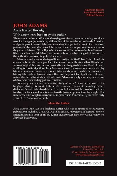 The rare man who can sift the unchanging out of a constantly changing world is a man for the ages. John Adams, philosopher of the Revolution and early America, and participant in many of the major events of that period, strove to find universal patterns in the lives of all men. His life and ideas are as pertinent to our time as they were to his own. We still ponder the nature of the unbreakable bond between liberty and law. As did Adams, we question how to relate the goal of freedom to the authority necessary in political society.Adams viewed man as a being of liberty subject to God's law. Th is colored his answer to the fundamental problem of how to reconcile liberty and law. His solution was not original. It was an answer rooted in the thought of classical Greek, Roman and English political philosophers. Moreover, it was the answer of a lawyer who, by his very profession, viewed man as an historian whose accumulated experience in history tells us about human nature. Because the principles of politics and human nature that he delineated are still relevant, Adams correctly shares a place as one of America's outstanding political thinkers.Burleigh gives us a warm, sensitive study of John Adams in the many roles he played during his eventful life: student, lawyer, polemicist, Founding Father, diplomat, President, husband, father. His own brilliance and the events of the times in which he lived combined to off er him the knowledge and fame he sought. Her new introduction explains our continuing interest in this central figure of the early years of the American Republic.