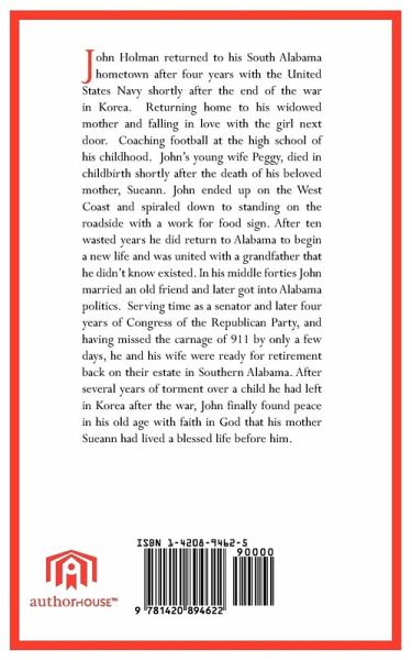 John Holman returned to his South Alabama hometown after four years with the United States Navy shortly after the end of the war in Korea. Returning home to his widowed mother and falling in love with the girl next door. John coached football at the high school of his childhood. John's young wife died in childbirth shortly after the death of his beloved mother. John ended up on the West Coast and spiraled down to standing on the roadside with a work for food sign. After ten wasted years in California he did return to Alabama to begin a new life. John was then united with a grandfather that he didn't know existed. In his late forties John married and old friend from his hometown. Several years later, to fulfill the wishes of his grandfather, John got involved with Alabama politics. He served time as a senator and then four years later in Congress for the Republican Party. Having missed the carnage of 911 by only a few days, he and his wife Marie were ready for retirement on their estate back home in Alabama. Don't glance at the last page of the book; let it's ending come as a surprise.