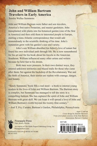 A juvenile biography of father and son, John and William Bartram, naturalists who lived in the late 18th and early 19th centuries in America. The Bartrams were America's first native botanists, father and son travelers, plant hunters, and master gardeners. They traveled the east coast and observed and wrote about the nature they found. Their story is full of adventure and curiosity. Their interests took them on wide travels, including through Florida in 1774. William Bartram's most famous book is Travels, which is of particular interest for its early description and drawings of Florida. His book is an important part of Florida's early records. This is seventh book in Pineapple Press's Young Readers series of biographies of famous people who influenced Florida. < < Previous in series Next in series > > See all of the books in this series