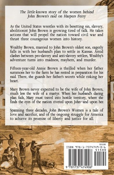 As the United States wrestles with its besetting sin-slavery-abolitionist John Brown is growing tired of talk. He takes actions that will propel the nation toward civil war and thrust three courageous women into history. Wealthy Brown, married to John Brown's oldest son, eagerly falls in with her husband's plan to settle in Kansas. Amid clashes between pro-slavery and anti-slavery settlers, Wealthy's adventure turns into madness, mayhem, and murder. Fifteen-year-old Annie Brown is thrilled when her father summons her to the farm he has rented in preparation for his raid. There, she guards her father's secrets while risking her heart. Mary Brown never expected to be the wife of John Brown, much less the wife of a martyr. When her husband's daring plan fails, Mary must travel into hostile territory, where she finds the eyes of the nation riveted upon John-and upon her. Spanning three decades, John Brown's Women is a tale of love and sacrifice, and of the ongoing struggle for America to achieve its promise of liberty and justice for all.