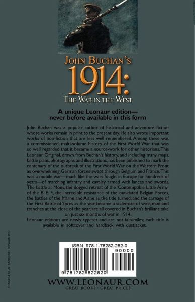 A unique Leonaur edition-never before available in this form John Buchan was a popular author of historical and adventure fiction whose works remain in print to the present day. He also wrote important works of non-fiction that are less well remembered. Among these was a commissioned, multi-volume history of the First World War that was so well regarded that it became a source-work for other historians. This Leonaur Original, drawn from Buchan's history, and including many maps, battle plans, photographs and illustrations, has been published to mark the centenary of the outbreak of the First World War on the Western Front as overwhelming German forces swept through Belgium and France. This was a mobile war-much like the wars fought in Europe for hundreds of years-of marching infantry and cavalry armed with lances and swords. The battle at Mons, the dogged retreat of the 'Contemptible Little Army' of the B. E. F., the incredible resistance of the out-dated Belgian Forces, the battles of the Marne and Aisne as the tide turned, and the carnage of the First Battle of Ypres as the war became a stalemate of wire, mud and trenches at the close of the year, are all covered in Buchan's brilliant take on just six months of war in 1914. Leonaur editions are newly typeset and are not facsimiles; each title is available in softcover and hardback with dustjacket.