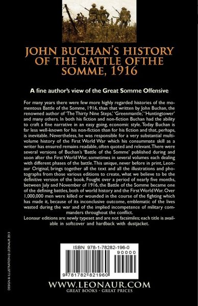 A fine author's view of the Great Somme Offensive For many years there were few more highly regarded histories of the momentous Battle of the Somme, 1916, than that written by John Buchan, the renowned author of 'The Thirty Nine Steps,' 'Greenmantle,' 'Huntingtower' and many others. In both his fiction and non-fiction Buchan had the ability to craft a fine narrative in an easy going, economic style. Today Buchan is far less well-known for his non-fiction than for his fiction and that, perhaps, is inevitable. Nevertheless, he was responsible for a very substantial multi-volume history of the First World War which his consummate skill as a writer has ensured remains readable, often quoted and relevant. There were several versions of Buchan's 'Battle of the Somme' published during and soon after the First World War, sometimes in several volumes each dealing with different phases of the battle. This unique, never before in print, Leonaur Original, brings together all the text and all the illustrations and photographs from those various editions to create, what we believe to be the definitive version of the book. Fought over a period of nearly five months, between July and November of 1916, the Battle of the Somme became one of the defining battles, both of world history and the First World War. Over 1,000,000 men were killed or wounded in the course of the fighting which has made it, because of its inconclusive outcome, emblematic of the lives wasted during the war and of the implied incompetence of military commanders throughout the conflict. Leonaur editions are newly typeset and are not facsimiles; each title is available in softcover and hardback with dustjacket.
