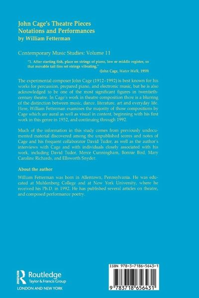 The experimental composer John Cage (1912-1992) is best known for his works in percussion, prepared piano, and electronic music, but he is also acknowledged to be one of the most significant figures in 20th century theatre. In Cage's work in theatre composition there is a blurring of the distinctions between music, dance, literature, art and everyday life. Here, William Fetterman examines the majority of those compositions by Cage which are audial as well as visual in content, beginning with his first work in this genre in 1952, and continuing through 1992.