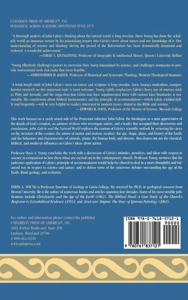This work focuses on a rarely noted side of the Protestant reformer John Calvin: the theologian as a man appreciative of the details of God's creation, an admirer of those who investigate nature, and a leader that accepted their discoveries and conclusions. John Calvin and the Natural World explores the content of Calvin's scientific outlook by reviewing his views on the structure of the cosmos; the nature of matter and motion; weather; the age, shape, place, and history of the Earth; and the behaviors and characteristics of animals, plants, the human body, and disease. Also drawn out, are the classical, biblical, and medieval influences on Calvin's ideas about nature. Professor Davis A. Young concludes the work with a discussion of Calvin's attitudes, practices, and ideas with respect to science in comparison to how these ideas are carried out in the contemporary church. Professor Young surmises that the judicious application of Calvin's principle of accommodation would help the church to deal in a more thoughtful and balanced way in respect to science and nature, and to defuse some of the rancorous debates surrounding the age of the Earth, flood geology, and evolution.
