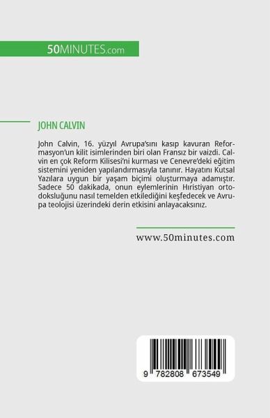 John Calvin, 16. yüzy¿l Avrupa's¿n¿ kas¿p kavuran Reformasyon'un kilit isimlerinden biri olan Frans¿z bir vaizdi. Calvin en çok Reform Kilisesi'ni kurmas¿ ve Cenevre'deki e¿itim sistemini yeniden yap¿land¿rmas¿yla tan¿n¿r. Hayat¿n¿ Kutsal Yaz¿lara uygun bir yäam biçimi olu¿turmaya adam¿¿t¿r. Sadece 50 dakikada, onun eylemlerinin H¿ristiyan ortodokslu¿unu nas¿l temelden etkiledi¿ini ke¿fedecek ve Avrupa teolojisi üzerindeki derin etkisini anlayacaks¿n¿z. Bu sade ve bilgilendirici kitap, Calvin'in H¿ristiyan Dininin Temelleri adl¿ ufuk aç¿c¿ eseri ve Cenevre Akademisi'nin kurulu¿u da dahil olmak üzere bäl¿ca bäar¿lar¿n¿n kapsaml¿ bir tart¿¿mas¿n¿ sunmaktad¿r. Ayr¿ca tam bir biyografi, siyasi, sosyal ve ekonomik bälama de¿erli bir giri¿ ve ö¿retisinin etkisinin ve Kalvinizmin yükseli¿inin bir de¿erlendirmesini de içeren bu kitap, size bu etkili ilahiyatç¿ hakk¿nda tüm temel bilgileri vermektedir.