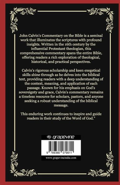 John Calvin's Commentary on the Bible is a seminal work that illuminates the scriptures with profound insights. Written in the 16th century by the influential Protestant theologian, this comprehensive commentary spans the entire Bible, offering readers a rich exploration of theological, historical, and practical perspectives. Calvin's rigorous scholarship and keen exegetical skills shine through as he delves into the biblical text, providing readers with a deep understanding of the context, meaning, and application of each passage. Known for his emphasis on God's sovereignty and grace, Calvin's commentary remains a timeless resource for scholars, pastors, and anyone seeking a robust understanding of the biblical message. This enduring work continues to inspire and guide readers in their study of the Word of God.