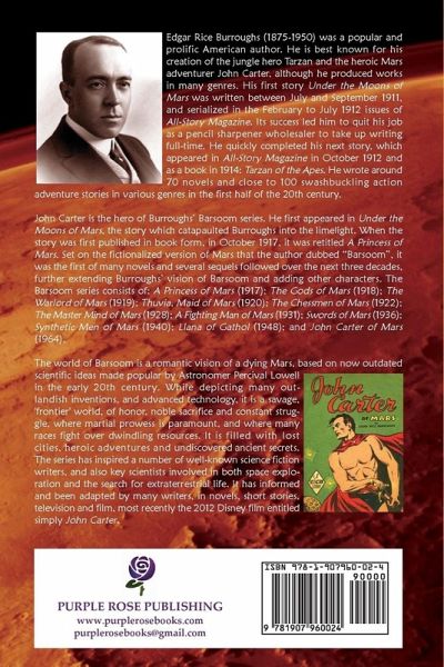 This Purple Rose book is a collection of the first five stories in Edgar Rice Burroughs' Barsoom series: A Princess of Mars (1917), The Gods of Mars (1918), The Warlord of Mars (1919), Thuvia, Maid of Mars (1920) and The Chessmen of Mars (1922). It contains all of the original frontispieces by Frank Schoonover and J. Allen St. John, enhanced and enlarged and is a high quality book with clear formatting and detailed contents. Visit Purple Rose at www.purplerosebooks.com and view our other titles and new releases. John Carter is the hero of Burroughs' Barsoom series. He first appeared in Under the Moons of Mars (later retitled A Princess of Mars) the story which catapaulted Burroughs into the limelight. It was the first of many novels and several sequels followed over the next three decades, further extending Burroughs' vision of Barsoom. The world of Barsoom is a romantic vision of a dying Mars, based on now outdated scientific ideas made popular by Astronomer Percival Lowell in the early 20th century. While depicting many outlandish inventions, and advanced technology, it is a savage, 'frontier' world, of honor, noble sacrifice and constant struggle, where martial prowess is paramount, and where many races fight over dwindling resources. It is filled with lost cities, heroic adventures and undiscovered ancient secrets. The series has inspired a number of well known science fiction writers, and also key scientists involved in both space exploration and the search for extraterrestrial life. It has informed and been adapted by many writers, in novels, short stories, television and film.
