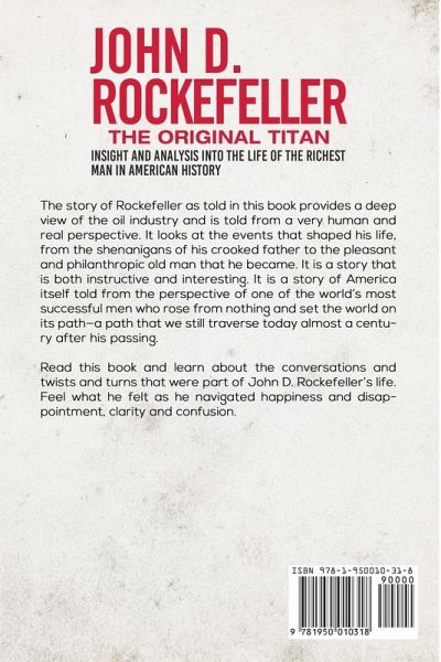 Rockefeller was the quintessential industrialist. He created an industry out of nascent oil and gas start-ups during a time when none existed. His strategies and tactics may not have been approved by all, but he was certain he was doing God's work. We live in a world today that is based on the actions of John D. Rockefeller. Everything we do and how we live are the result of oil and its power. This inherent structure is based on what one man did when the oil industry was just starting off. He was strategic in his thinking, choosing to enter the refining side of the oil industry instead of the exploring and drilling aspect of it. He started with one refinery and then quickly bought up more than 90 percent of his competitors in the state within a few short years. The story of Rockefeller as told in this book provides a deep view of the oil industry and is told from a very human and real perspective. It looks at the events that shaped his life, from the shenanigans of his crooked father to the pleasant and philanthropic old man that he became. It is a story that is both instructive and interesting. It is a story of America itself told from the perspective of one of the world's most successful men who rose from nothing and set the world on its path-a path that we still traverse today almost a century after his passing. Read this book and learn about the conversations and twists and turns that were part of John D. Rockefeller's life. Feel what he felt as he navigated happiness and disappointment, clarity and confusion. What are you waiting for? Scroll up and click the 'Buy Now' button to learn about 'The Original Titan.'