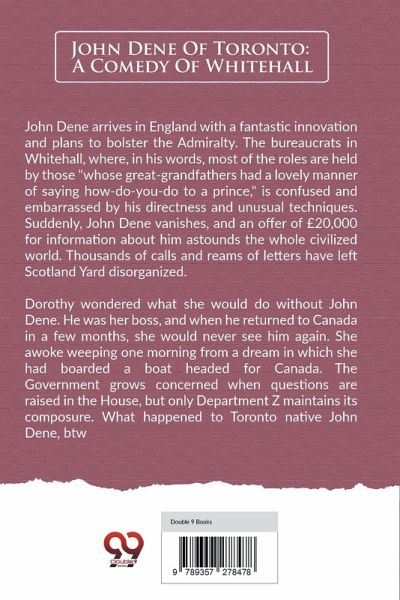 John Dene arrives in England with a fantastic innovation and plans to bolster the Admiralty. The bureaucrats in Whitehall, where, in his words, most of the roles are held by those ""whose great-grandfathers had a lovely manner of saying how-do-you-do to a prince,"" is confused and embarrassed by his directness and unusual techniques. Suddenly, John Dene vanishes, and an offer of £20,000 for information about him astounds the whole civilized world. Thousands of calls and reams of letters have left Scotland Yard disorganized. Dorothy wondered what she would do without John Dene. He was her boss, and when he returned to Canada in a few months, she would never see him again. She awoke weeping one morning from a dream in which she had boarded a boat headed for Canada. The Government grows concerned when questions are raised in the House, but only Department Z maintains its composure. What happened to Toronto native John Dene, btw