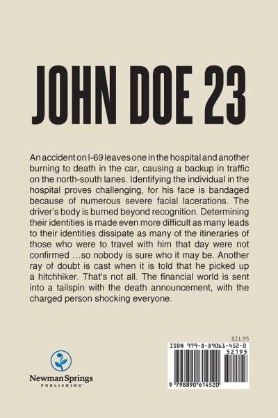 An accident on I-69 leaves one in the hospital and another burning to death in the car, causing a backup in traffic on the north-south lanes. Identifying the individual in the hospital proves challenging, for his face is bandaged because of numerous severe facial lacerations. The driver's body is burned beyond recognition. Determining their identities is made even more difficult as many leads to their identities dissipate as many of the itineraries of those who were to travel with him that day were not confirmed ...so nobody is sure who it may be. Another ray of doubt is cast when it is told that he picked up a hitchhiker. That's not all. The financial world is sent into a tailspin with the death announcement, with the charged person shocking everyone.