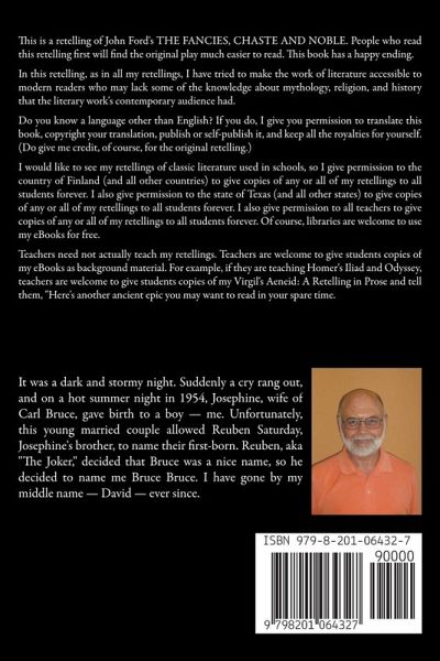 This is an easy-to-read retelling of John Ford's THE FANCIES, CHASTE AND NOBLE. People who read this retelling first will find the original play much easier to read. This book has a happy ending. Do you know a language other than English? If you do, I give you permission to translate this book, copyright your translation, publish or self-publish it, and keep all the royalties for yourself. (Do give me credit, of course, for the original retelling.) I would like to see my retellings of classic literature used in schools, so I give permission to the country of Finland (and all other countries) to give copies of any or all of my retellings to all students forever. I also give permission to the state of Texas (and all other states) to give copies of any or all of my retellings to all students forever. I also give permission to all teachers to give copies of any or all of my retellings to all students forever. Of course, libraries are welcome to use my eBooks for free. Teachers need not actually teach my retellings. Teachers are welcome to give students copies of my eBooks as background material. For example, if they are teaching Homer's Iliad and Odyssey, teachers are welcome to give students copies of my Virgil's Aeneid: A Retelling in Prose and tell them, "Here's another ancient epic you may want to read in your spare time.