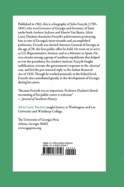 Published in 1962, this is a biography of John Forsyth (1780-1841) who was Governor of Georgia and Secretary of State under both Andrew Jackson and Martin Van Buren. Alvin Laroy Duckett chronicles Forsyth's achievements portraying him as one of Georgia's most versatile and accomplished politicians. Forsyth was elected Attorney General of Georgia at the age of twenty-eight, the first public office he held. He went on to serve as U.S. Representative, Senator, and as a Minister to Spain. He was a leader among a group of southern republicans that helped to win the presidency for Andrew Jackson. Forsyth fought nullification, oversaw the government's response to the Amistad case, and led the pro-removal reply to the Indian Removal Act of 1830. Though he worked primarily at the federal level, Forsyth also contributed greatly to the development of Georgia during his career.