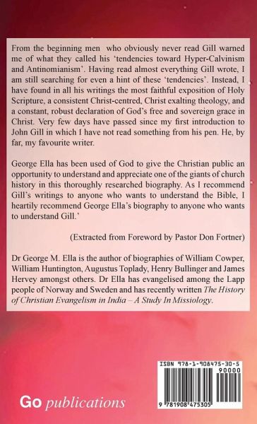 From the beginning men who obviously never read Gill warned me of what they called his 'tendencies toward Hyper-Calvinism and Antinomianism'. Having read almost everything Gill wrote, I am still searching for even a hint of these 'tendencies'. Instead, I have found in all his writings the most faithful exposition of Holy Scripture, a consistent Christ-centred, Christ exalting theology, and a constant, robust declaration of God's free and sovereign grace in Christ. Very few days have passed since my first introduction to John Gill in which I have not read something from his pen. He, by far, my favourite writer. George Ella has been used of God to give the Christian public an opportunity to understand and appreciate one of the giants of church history in this thoroughly researched biography. As I recommend Gill's writings to anyone who wants to understand the Bible, I heartily recommend George Ella's biography to anyone who wants to understand Gill.' Don Fortner Biographical table 1. Introduction 2. The world of 1697 3. The birth of an infant prodigy 4. Making his calling and election sure 5. The Goat Yard Declaration of Faith 6. The voice of the beloved 7. Defender of the faith 8. Good news of God's everlasting love 9. A saint is slandered 10. The pastor in the pulpit 11. Laying the axe to popery's roots 12. His work accomplished 13. The widowed church 14. Three hundred years on: The Modern Question brought up to date Appendix 1: The full gospel and the free offerAppendix 2: Gill on linguistics and Hebrew vocalisation Glossary Bibliography Index of persons and placesIndex of topics and institutionsIndex of works quoted Index of scriptural references