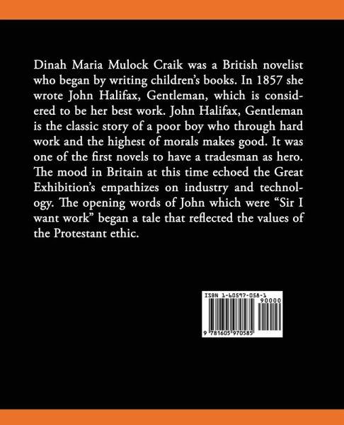 Dinah Maria Mulock Craik was a British novelist who began by writing children's books. In 1857 she wrote John Halifax, Gentleman, which is considered to be her best work. John Halifax, Gentleman is the classic story of a poor boy who through hard work and the highest of morals makes good. It was one of the first novels to have a tradesman as hero. The mood in Britain at this time echoed the Great Exhibition's empathizes on industry and technology. The opening words of John which were "Sir I want work" began a tale that reflected the values of the Protestant ethic.