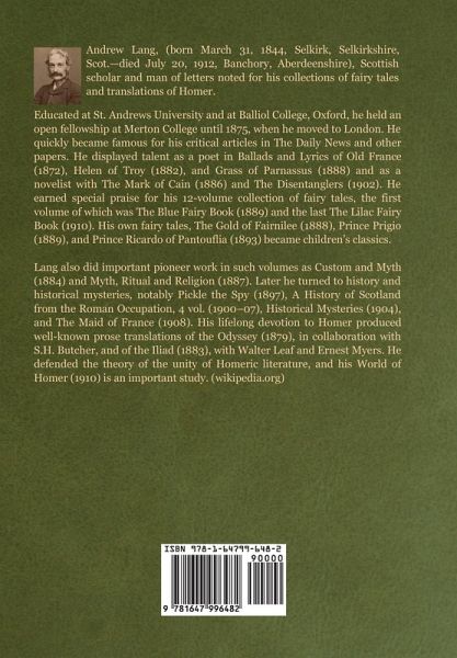 Andrew Lang, (born March 31, 1844, Selkirk, Selkirkshire, Scot.--died July 20, 1912, Banchory, Aberdeenshire), Scottish scholar and man of letters noted for his collections of fairy tales and translations of Homer. Educated at St. Andrews University and at Balliol College, Oxford, he held an open fellowship at Merton College until 1875, when he moved to London. He quickly became famous for his critical articles in The Daily News and other papers. He displayed talent as a poet in Ballads and Lyrics of Old France (1872), Helen of Troy (1882), and Grass of Parnassus (1888) and as a novelist with The Mark of Cain (1886) and The Disentanglers (1902). He earned special praise for his 12-volume collection of fairy tales, the first volume of which was The Blue Fairy Book (1889) and the last The Lilac Fairy Book (1910). His own fairy tales, The Gold of Fairnilee (1888), Prince Prigio (1889), and Prince Ricardo of Pantouflia (1893) became children's classics. Lang also did important pioneer work in such volumes as Custom and Myth (1884) and Myth, Ritual and Religion (1887). Later he turned to history and historical mysteries, notably Pickle the Spy (1897), A History of Scotland from the Roman Occupation, 4 vol. (1900-07), Historical Mysteries (1904), and The Maid of France (1908). His lifelong devotion to Homer produced well-known prose translations of the Odyssey (1879), in collaboration with S.H. Butcher, and of the Iliad (1883), with Walter Leaf and Ernest Myers. He defended the theory of the unity of Homeric literature, and his World of Homer (1910) is an important study. (wikipedia.org)