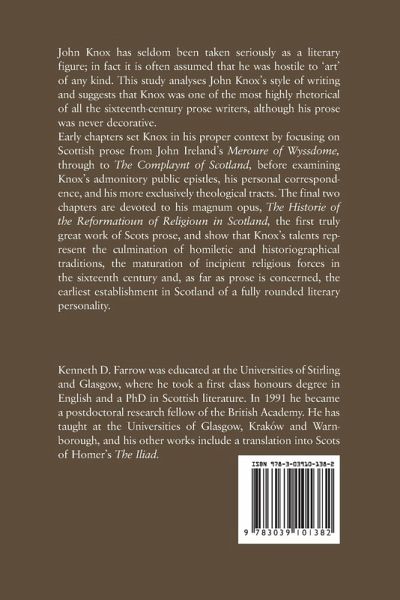 John Knox has seldom been taken seriously as a literary figure; in fact it is often assumed that he was hostile to 'art' of any kind. This study analyses John Knox's style of writing and suggests that Knox was one of the most highly rhetorical of all the sixteenth-century prose writers, although his prose was never decorative.