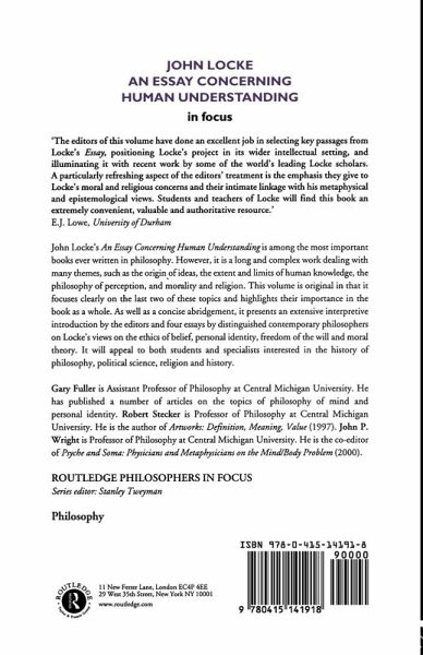 John Locke's Essay Concerning Human Understanding is among the most important books in philosophy ever written. It is also a difficult work dealing with many themes, including the origin of ideas; the extent and limits of human knowledge; the philosophy of perception; and religion and morality. This volume is original in that it focuses on the last two of these topics and provides a clear and insightful survey of these overlooked aspects of Locke's best known work. Four eminent Locke scholars present authoritative discussions of Locke's view on the ethics of belief, personal identity, free will and moral theory. Contributors include John Passmore (Australian National University), Harold Noonan (Birmingham University), Vere Chappell (University of Massachusetts, Amherst), and Daniel Flage (James Madison University).