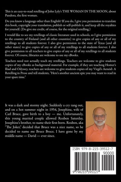 This is an easy-to-read retelling of John Lyly's THE WOMAN IN THE MOON, about Pandora, the first woman. Do you know a language other than English? If you do, I give you permission to translate this book, copyright your translation, publish or self-publish it, and keep all the royalties for yourself. (Do give me credit, of course, for the original retelling.) I would like to see my retellings of classic literature used in schools, so I give permission to the country of Finland (and all other countries) to give copies of any or all of my retellings to all students forever. I also give permission to the state of Texas (and all other states) to give copies of any or all of my retellings to all students forever. I also give permission to all teachers to give copies of any or all of my retellings to all students forever. Of course, libraries are welcome to use my eBooks. Teachers need not actually teach my retellings. Teachers are welcome to give students copies of my eBooks as background material. For example, if they are teaching Homer's Iliad and Odyssey, teachers are welcome to give students copies of my Virgil's Aeneid: A Retelling in Prose and tell students, "Here's another ancient epic you may want to read in your spare time."