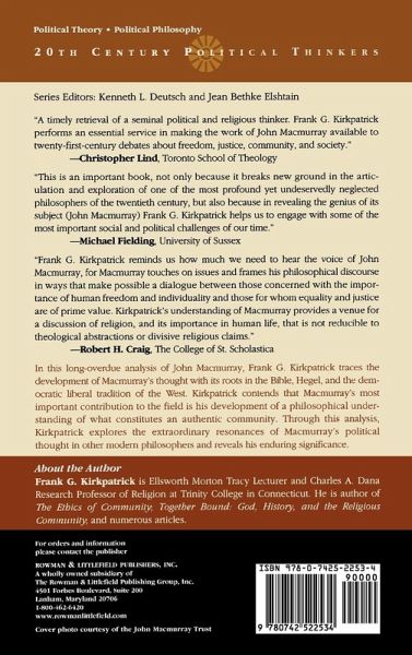Chapter 1 Introduction Chapter 2 An Intellectual Biography of John Macmurray: From Evangelicalism to Marxism Chapter 3 Macmurray's Engagement with Marxian Thought in the 1930s Chapter 4 Community in Marx and Macmurray: A Reappraisal Chapter 5 Christianity, Fascism, and the Clue to History Chapter 6 The Gifford Lectures: The Self as Agent Chapter 7 The Gifford Lectures: Persons in Relation Chapter 8 Macmurray and Contemporary Political Philosophy Chapter 9 The Family and Small Communities in Political Thought Chapter 10 Democracy, Human Nature, and the Nation-State Chapter 11 Bibliography Chapter 12 Index Chapter 13 About the Author