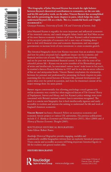 John Maynard Keynes is arguably the most important and influential economist of the twentieth century, and stands alongside Adam Smith and Karl Marx as one of the most famous economic thinkers of all time. Keynes's radical reassessment of the accepted principles of economics led to new ways of thinking about how to deal with financial crises and economic depressions, and encouraged governments to increase levels of state investment to create economic growth. This historical biography shows how Keynes was more than an academic theorist and how his policy proposals had a significant impact on the economic and financial architecture of many Western countries from the 1920s onward, and on the post-war international financial system. It also tells the story of his colourful private life - Keynes was an active member of the Bloomsbury group of artists and intellectuals, he entertained various 'secret' male lovers in his youth, he married a famous Russian ballerina in 1925 and he was also an astute collector of fine art and antiquarian books. Vincent Barnett emphasizes the relationship between the personal and professional by presenting the book chapters in pairs, examining first the central features of Keynes's life, personal development and policy ideas over the period in question, and then the theoretical content of his major writings from the same period. Barnett argues controversially that allowing psychology a much greater role within economics was a main but often-neglected feature of The General Theory of Employment, Interest and Money, and that Keynes's policy writings were more concerned with the Britain's national interest than is sometimes recognised. The result is a concise new biography that is both intellectually rigorous and easily accessible to students and anyone else seeking to understand the life and work of England's foremost economist.