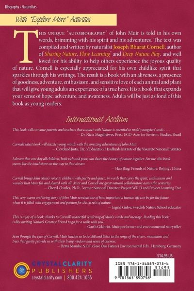 Sharing Narture Books Presents-John Muir: My Life with Nature This unique "autobiography" of John Muir is told in his own words, brimming with his spirit and his adventures. The text was compiled and written by naturalist Joseph Bharat Cornell, author of Sharing Nature, and well loved for his ability to help others experience the joyous quality of nature. Cornell is especially appreciated for his own childlike spirit that sparkles through his writings. The result is a book with an aliveness, a presence of goodness, adventure, enthusiasm, and sensitive love of each animal and plant that will give young adults an experience of a true hero. It is a book that expands your sense of hope, adventure, and awareness. Adults will be just as fond of this book as young readers. Cornell has received many international awards for his Sharing Nature books and work. He received the prestigious Countess Sonja-Bernadotte Prize in Germany for his vast influence on environmental education in Central Europe. In 2011 Cornell was selected as one of the world's "100 most influential opinion leaders committed to the Environment" by the French organization, Les Anges Gardiens de la Plante. Known for his warmth and joyful enthusiasm, Cornell "has a genius for finding the essence of a subject, explaining it in clear and compelling ways, and then giving the reader creative exercises to gain an actual experience."