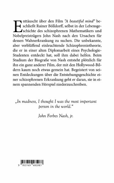 Enttäuscht über den Film A beautiful mind beschließt Rainer Bölldorff, selbst in der Lebensgeschichte des schizophrenen Mathematikers und Nobelpreisträgers John Nash nach den Ursachen für dessen Wahnerkrankung zu suchen. Die unbekannte, aber verblüffend einleuchtende Schizophrenietheorie, die er in einer alten Diplomarbeit eines Psychologie-Studenten entdeckt hat, soll ihm dabei helfen. Beim Studium der Biografie von Nash entsteht plötzlich für ihn ein ganz anderer Film, der mit den Hollywood-Bildern kaum noch etwas gemein hat. Begeistert von seinen Entdeckungen über die Entstehungsgeschichte einer schizophrenen Erkrankung geht er daran, sie in einem spannenden Hörspiel niederzuschreiben.