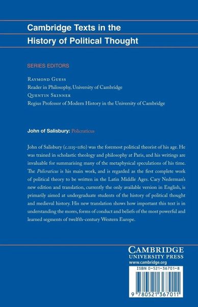 John of Salisbury (c.1115-1180) was the foremost political theorist of his age. He was trained in scholastic theology and philosophy at Paris, and his writings are invaluable for summarising many of the metaphysical speculations of his time. The Policraticus is his main work, and is regarded as the first complete work of political theory to be written in the Latin Middle Ages. Cary Nederman's 1991 edition and translation is primarily aimed at undergraduate students of the history of political thought and medieval history. His translation shows how important this text is in understanding the mores, forms of conduct and beliefs of the most powerful and learned segments of twelfth-century Western Europe.