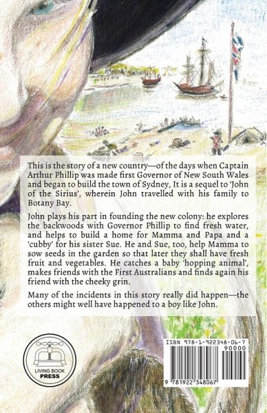 This is the story of a new country-of the days when Captain Arthur Phillip was made first Governor of New South Wales and began to build the town of Sydney, It is a sequel to 'John of the Sirius', wherein John traveled with his family to Botany Bay. John plays his part in founding the new colony: he explores the backwoods with Governor Phillip to find fresh water, and helps to build a home for Mamma and Papa and a 'cubby' for his sister Sue. He and Sue, too, help Mamma to sow seeds in the garden so that later they shall have fresh fruit and vegetables. He catches a baby 'hopping animal', makes friends with the First Australians, and finds again his friend with the cheeky grin. Many of the incidents in this story really did happen-the others might well have happened to a boy like John.