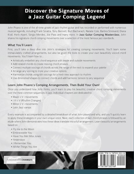 Are you bored of playing the same old jazz guitar chords? Playing rhythm guitar is one thing, but going beyond that to connect the chords with beautiful melodic phrasing is called comping. John Pisano is one of the all-time greats of jazz rhythm guitar and has worked with Frank Sinatra, Tony Bennett, Burt Bacharach, Natalie Cole, Barbra Streisand, Diana Krall and many more. Plus, for over 35 years, he was also Joe Pass' guitar duo partner, racking up dozens of iconic jazz guitar recordings. Learn Authentic Jazz Comping Skills with a Master In Jazz Guitar Comping Masterclass, John Pisano shares his creative guitar chord movements over a selection of the most famous jazz standards. Naturally, you'll learn some immaculately crafted comping arrangements, but there's so much more! You'll go way beyond the typical jazz rhythm guitar parts most guitarists use, and learn to play beautifully voiced movements that decorate the chords and become an integral part of the tune itself... ... If you took away the rest of the band, your guitar part would stand alone and still entertain the crowd. What You'll Learn First, you'll take a deep dive into John's unique strategies for creating comping movements. Here, you'll discover the tools you can use to develop your own stunning arrangements. In a clearly illustrated, step-by-step guide, you'll learn how to: · Artistically embellish any chord sequence with inside and outside movements · Add related chords to create moving chord phrases · Connect multiple voicings of chords across the range of the neck to expand your palette · Arrange any voicing to triple your creative options · Harmonize chords using 6th voicings for a fresh new approach to rhythm · Use diminished shapes to connect chords and add harmonic tension to any sequence ¿