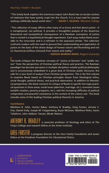 Introduction, Anthony B. Bradley Part One: Understanding Rawls Chapter 1: The "early Rawls": What is justice as fairness?, Karen Taliaferro Chapter 2: The "late Rawls": What is public reason?, Micah Watson Part Two: Rawls and Christian Ethics Chapter 3: "Much More than Fairness: The Shape of Justice in the New Testament"?, Matthew B. Arbo Chapter 4: What does justice mean without God?, Jerome C. Foss Chapter 5: Can human beings have intrinsic dignity or equality without God?, Matthew Parks Chapter 6. The secularist biases of Rawls' "neutral" rules, Hunter Baker Chapter 7. Does "pluralism" require religion to be either rationalized or cast out of society?, Joseph Knippenberg Part Three: What It Means in Practice Chapter 8: Rawls and Civil Society, Daniel Kelly Chapter 9: Rawls and Economic Justice, John Addison Teevan Chapter 10. Rawls and the Culture War, Bryan McGraw Conclusion, Greg Forster