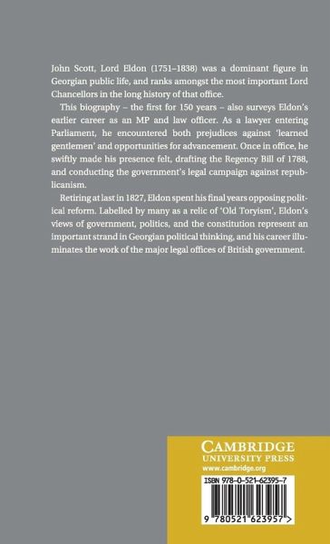 John Scott, Lord Eldon (1751-1838) was a dominant figure in Georgian public life, and ranks among the most important Lord Chancellors in the long history of that office. This biography - the first for one hundred and fifty years - also surveys Eldon's earlier career as an MP and Law Officer. As a lawyer entering Parliament, he encountered both prejudices against 'learned gentlemen' and opportunities for advancement. Once in office he swiftly made his presence felt, drafting the Regency bill of 1788, and conducting the government's legal campaign against Republicanism. Retiring at last in 1827, Eldon spent his final years opposing political reform. Labelled by many as a relic of 'Old Toryism', Eldon's views of government, politics, and the constitution represent an important strand in Georgian political thinking, and his career illuminates the work of the major legal offices of British government.