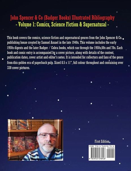 John Spencer & Co (Badger Books) Illustrated Bibliography Volume 1 : Comics, Science Fiction and Supernatural - This book covers the Comics, Science Fiction and Supernatural genres from the John Spencer & Co publishing house created by Samuel Assael in the late 1940s. This volume includes the early 1950s digests and the later Badger /Cobra books, which ran through the 1950s,60s and 70s. Each book and comic entry is accompanied by a cover picture, along with details of the content, publication dates, cover artist and editor's notes. It is intended for collectors and fans of the genre from this golden era of paperback pulp. 8.5 x 11 size, full colour and over 330 cover pictures
