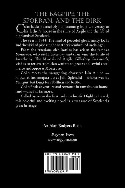 THE BAGPIPE, THE SPORRAN, AND THE DIRK Colin had a melancholy homecoming from University to his father's house in the shire of Argile and the fabled highlands of Scotland. The year is 1744. The land of peaceful glens, misty lochs and the skirl of pipes in the heather is embroiled in change. From the fractious clan battles has arisen the famous Montrose, who sacks Inveraray and then wins the battle of Inverlochy. The Marquis of Argile, Gillesbeg Gruamach, wishes to return from clan warfare to peace and lawful commerce and opposes Montrose. Colin meets the swaggering character Iain Aluinn -- known to his compatriots as John Splendid -- who serves his Marquis, but longs for rebellion and battle. Colin finds adventure and romance in tumultuous homeland -- and far, far more.