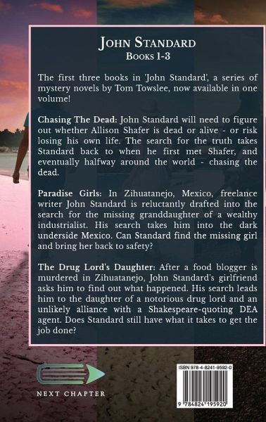 The first three books in 'John Standard', a series of mystery novels by Tom Towslee, now available in one volume! Chasing The Dead: John Standard will need to figure out whether Allison Shafer is dead or alive - or risk losing his own life. The search for the truth takes Standard back to when he first met Shafer, and eventually halfway around the world - chasing the dead. Paradise Girls: In Zihuatanejo, Mexico, freelance writer John Standard is reluctantly drafted into the search for the missing granddaughter of a wealthy industrialist. His search takes him into the dark underside Mexico. Can Standard find the missing girl and bring her back to safety? The Drug Lord's Daughter: After a food blogger is murdered in Zihuatanejo, John Standard's girlfriend asks him to find out what happened. His search leads him to the daughter of a notorious drug lord and an unlikely alliance with a Shakespeare-quoting DEA agent. Does Standard still have what it takes to get the job done?