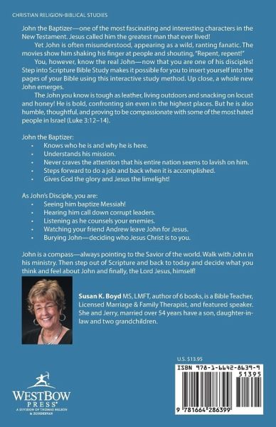 John the Baptizer-one of the most fascinating and interesting characters in the New Testament. Jesus called him the greatest man that ever lived! Yet John is often misunderstood, appearing as a wild, ranting fanatic. The movies show him shaking his finger at people and shouting, "Repent, repent!" You, however, know the real John-now that you are one of his disciples! Step into Scripture Bible Study makes it possible for you to insert yourself into the pages of your Bible using this interactive study method. Up close, a whole new John emerges. The John you know is tough as leather, living outdoors and snacking on locust and honey! He is bold, confronting sin even in the highest places. But he is also humble, thoughtful, and proving to be compassionate with some of the most hated people in Israel (Luke 3:12-14). John the Baptizer: Knows who he is and why he is here. Understands his mission. Never craves the attention that his entire nation seems to lavish on him. Steps forward to do a job and back when it is accomplished. Gives God the glory and Jesus the limelight! As John's Disciple, you are: Seeing him baptize Messiah! Hearing him call down corrupt leaders. Listening as he counsels your enemies. Watching your friend Andrew leave John for Jesus. Burying John-deciding who Jesus Christ is to you. John is a compass-always pointing to the Savior of the world. Walk with John in his ministry. Then step out of Scripture and back to today and decide what you think and feel about John and finally, the Lord Jesus, himself!