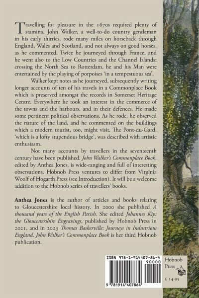 Travelling for pleasure in the 1670s required plenty of stamina. John Walker, a well-to-do country gentleman in his early thirties, rode many miles on horseback through England, Wales and Scotland, and not always on good horses, as he commented. Twice he journeyed through France, and he went also to the Low Countries and the Channel Islands; crossing the North Sea to Rotterdam, he and his man were entertained by the playing of porpoises 'in a tempestuous sea'. Walker kept notes as he journeyed, subsequently writing longer accounts of ten of his travels in a Commonplace Book which is preserved amongst the records in Somerset Heritage Centre. Everywhere he took an interest in the commerce of the towns and the harbours, and in their defences. He made some pertinent political observations. As he rode, he observed the nature of the land, and he commented on the buildings which a modern tourist, too, might visit. The Pond-du-Gard, 'which is a lofty stupendous bridge', was described with artistic enthusiasm. Not many accounts by travellers in the seventeenth century have been published. John Walker's Commonplace Book, edited by Anthea Jones, is wide-ranging and full of interesting observations.