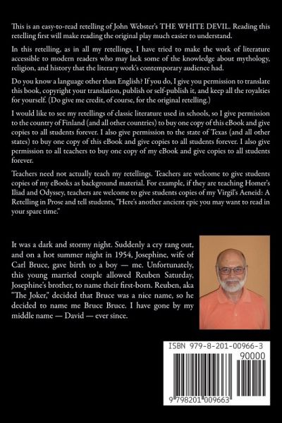 This is an easy-to-read retelling of John Webster's THE WHITE DEVIL. Reading this retelling first will make reading the original play much easier to understand. Do you know a language other than English? If you do, I give you permission to translate this book, copyright your translation, publish or self-publish it, and keep all the royalties for yourself. (Do give me credit, of course, for the original retelling.) I would like to see my retellings of classic literature used in schools, so I give permission to the country of Finland (and all other countries) to buy one copy of this eBook and give copies to all students forever. I also give permission to the state of Texas (and all other states) to buy one copy of this eBook and give copies to all students forever. I also give permission to all teachers to buy one copy of my eBook and give copies to all students forever. Teachers need not actually teach my retellings. Teachers are welcome to give students copies of my eBooks as background material. For example, if they are teaching Homer's Iliad and Odyssey, teachers are welcome to give students copies of my Virgil's Aeneid: A Retelling in Prose and tell students, "Here's another ancient epic you may want to read in your spare time."