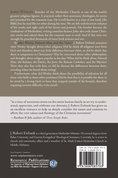John Wesley, founder of the Methodist Church, is one of the world's greatest religious figures. A practical rather than systematic theologian, he wrote and preached for the common man. He is well known as a man of one book (the Bible) but he read like no other during his time. We are left with fourteen volumes of his works and eight each of his letters and journals. His brother became the troubadour of Methodism, writing countless hymns. John also took classic Christian works and edited them for the common man to read. And if this were not enough, he preached thousands of times both indoors and out. In John Wesley, Natural Man, and the 'Isms', J. Robert Ewbank examines what Wesley thought about other religions. Did he think all religions were from God and therefore there was little difference between them, or did he think that there is uniqueness in Christianity? Was he concerned about other philosophies and thoughts about religion popular in his day? What did he think about Natural Man, the Indians, the Deists, the Jews, the Roman Catholics, and the Mystics? Were they also fine with him, or did he discuss the differences between them, revealing where he found them wrong? Furthermore, what did Wesley think about the possibility of salvation for all those who held to these other positions? Did he find that it is possible for them to be saved by a loving God, or have they stepped outside of the bounds, therefore requiring extreme difficulty to be saved?