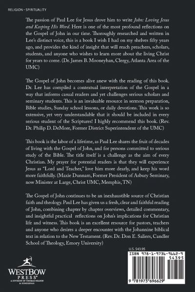 The passion of Paul Lee for Jesus drove him to write John: Loving Jesus and Keeping His Word. Here is one of the most profound reflections on the Gospel of John in our time. Thoroughly researched and written in Lee's distinct voice, this is a book I wish I had on my shelves fifty years ago, and provides the kind of insight that will reach preachers, scholars, students, and anyone who wishes to learn more about the living Christ for years to come. (Dr. James B. Mooneyhan, Clergy, Atlanta Area of the UMC) The Gospel of John becomes alive anew with the reading of this book. Dr. Lee has compiled a contextual interpretation of the Gospel in a way that informs casual readers and yet challenges serious scholars and seminary students. This is an invaluable resource in sermon preparation, Bible studies, Sunday school lessons, or daily devotions. This work is so extensive, yet very understandable that it should be included in every serious student of the Scriptures! I highly recommend this book. (Rev. Dr. Philip D. DeMore, Former District Superintendent of the UMC) This book is the labor of a lifetime, as Paul Lee shares the fruit of decades of living with the Gospel of John, and for persons committed to serious study of the Bible. The title itself is a challenge as the aim of every Christian. My prayer for potential readers is that they will experience Jesus as "Lord and Teacher," love him more dearly, and keep his word more faithfully. (Maxie Dunnam, Former President of Asbury Seminary, now Minister at Large, Christ UMC, Memphis, TN) The Gospel of John continues to be an inexhaustible source of Christian faith and theology. Paul Lee has given us a fresh, clear and faithful reading of John, combining chapter by chapter overviews, detailed commentary, and insightful practical reflections on John's implications for Christian life and witness. This book is an excellent resource for pastors, teachers and anyone who desires a deeper encounter with the Johannine biblical text in relation to the New Testament. (Rev. Dr. Don E. Saliers, Candler School of Theology, Emory University)