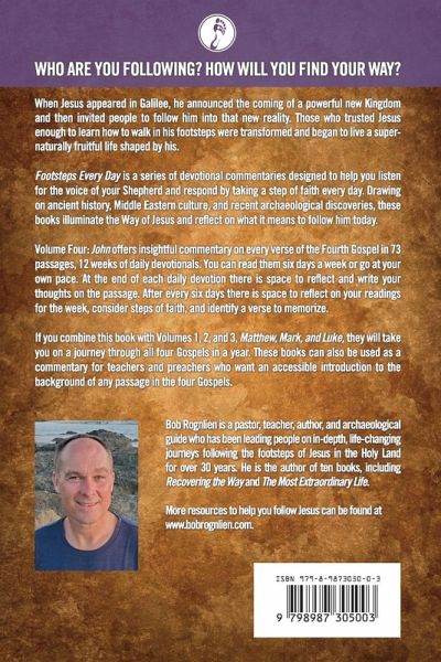WHO ARE YOU FOLLOWING? HOW WILL YOU FIND YOUR WAY? When Jesus appeared in Galilee, he announced the coming of a powerful new Kingdom and then invited people to follow him into that new reality. Those who trusted Jesus enough to learn how to walk in his footsteps were transformed and began to live a supernaturally fruitful life shaped by his. Footsteps Every Day is a series of devotional commentaries designed to help you listen for the voice of your Shepherd and respond by taking a step of faith every day. Drawing on ancient history, Middle Eastern culture, and recent archaeological discoveries, these books illuminate the Way of Jesus and reflect on what it means to follow him today. Volume Four: John offers insightful commentary on every verse of the Fourth Gospel in 74 passages, 12 weeks of daily devotionals. You can read them six days a week or go at your own pace. At the end of each daily devotion there is space to reflect and write your thoughts on the passage. After every six days there is space to reflect on your readings for the week, consider steps of faith, and identify a verse to memorize. If you combine this book with Volumes 1, 2, and 3, Matthew, Mark, and Luke, they will take you on a journey through all four Gospels in a year. These books can also be used as a commentary for teachers and preachers who want an accessible introduction to the background of any passage in the four Gospels. They can also be used as a study guide for small groups, Bible studies, and Sunday School classes. Bob Rognlien is a pastor, teacher, author, and archaeological guide who has been leading people on in-depth, life-changing journeys following the footsteps of Jesus in the Holy Land for over 30 years. He is the author of ten books, including Recovering the Way and The Most Extraordinary Life. More resources to help you follow Jesus can be found www.bobrognlien.com.