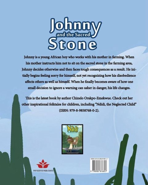 'Johnny and the Sacred Stone' is the latest inspirational folktale by author Chinelo Emekwue. Johnny is a young African boy who works with his mother in farming. When his mother instructs him not to sit on the sacred stone in the farming area, Johnny decides otherwise and then faces tough consequences as a result. He initially begins feeling sorry for himself, not yet recognizing how his disobedience affects others as well as himself. When he finally becomes aware of how one small decision to ignore a warning can usher in danger, his life changes.