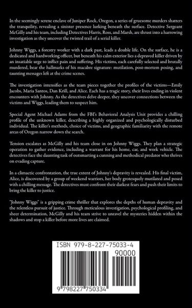 In the seemingly serene enclave of Juniper Rock, Oregon, a series of gruesome murders shatters the tranquility, revealing a sinister presence lurking beneath the surface. Detective Sergeant McGilly and his team, including Detectives Harris, Ross, and Marsh, are thrust into a harrowing investigation as they uncover the twisted trail of a serial killer. Johnny Wiggs, a forestry worker with a dark past, leads a double life. On the surface, he is a dedicated and hardworking officer, but beneath his calm exterior lies a depraved killer driven by an insatiable urge to inflict pain and suffering. His victims, each carefully selected and brutally murdered, bear the hallmarks of his macabre signature: mutilation, post-mortem posing, and taunting messages left at the crime scenes. The investigation intensifies as the team pieces together the profiles of the victims-Emily Jacobs, Maria Santos, Dan Krill, and Alice. Each has a tragic story, their lives ending in violent encounters with Johnny. As the detectives delve deeper, they uncover connections between the victims and Wiggs, leading them to suspect him. Special Agent Michael Adams from the FBI's Behavioral Analysis Unit provides a chilling profile of the unknown killer, describing a highly organized and psychologically disturbed individual. The killer's methods, choice of victims, and geographic familiarity with the remote areas of Oregon narrow down the search. Tension escalates as McGilly and his team close in on Johnny Wiggs. They plan a strategic operation to gather evidence, including a warrant for his home, car, and work vehicle. The detectives face the daunting task of outsmarting a cunning and methodical predator who thrives on evading capture. In a climactic confrontation, the true extent of Johnny's depravity is revealed. His final victim, Alice, is discovered by a group of weekend warriors, her body grotesquely mutilated and posed with a chilling message. The detectives must confront their darkest fears and push their limits to bring the killer to justice. "Johnny Wiggs" is a gripping crime thriller that explores the depths of human depravity and the relentless pursuit of justice. Through meticulous investigation, psychological profiling, and sheer determination, McGilly and his team strive to unravel the mysteries hidden within the shadows and stop a killer before more lives are claimed.