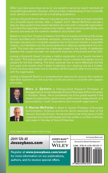 Often business executives serve (or are asked to serve) as board members of nonprofit organizations. However, without a clear understanding of how nonprofits work, service on a board can be a frustrating experience. Joining a Nonprofit Board offers an important guide to the roles and responsibilities of a nonprofit board member. Marc J. Epstein and F. Warren McFarlan provide a step-by-step guide to how board members can work with a nonprofit organization to achieve the organization's overarching mission, attain financial sustainability, and develop and execute the systems needed to accomplish both. Based on more than 10 years of research from Rice University and Harvard Business School and filled with illustrative examples, Joining a Nonprofit Board explores the basic structure of a nonprofit, explains how to build and monitor a nonprofit's mission, and identifies how the board performs an effective assessment of a non-profit. The book also explores the challenges posed by the duality of leadership between the unpaid volunteer non-executive chairman of the board and the CEO. Joining a Nonprofit Board includes a helpful explanation of a "board member's life cycle." The authors start with the decision to join a board and explain how to prepare for the first meeting. The book explores how to serve effectively the first two years and reveals what it takes to develop your ongoing role as a trustee. Finally the book describes how to transition off the board to other forms of service with the organization. Joining a Nonprofit Board is a comprehensive resource for anyone who wants to take their experience in the business world and serve a nonprofit with passion and clarity.