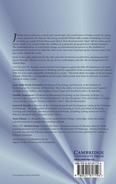 Joining Society asks precise questions: To what are the young socialized? Which skills, modes of thinking or action are required from them and what are their developmental value? Socialization tends to be viewed within the confines of a particular geographical or cultural situation. The multi-national list of contributors brings an international perspective to the problem of socialization to work and to adult life, while at the same time emphasizing the common issues that face youth around the world. Some of the topics addressed are the rules and roles involved in socialization, attaining personal agency through collective activity, use of new technologies, and the role of intergenerational relationships. This book sheds new light on the processes through which society may hope to intervene in positive ways with today's youth.