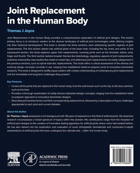 Joint Replacement in the Human Body provides a comprehensive exploration of artificial joint designs. The book's primary focus is to introduce readers to the diverse landscape of artificial joint technologies while offering insights into their historical development. This book is divided into three sections, each addressing specific aspects of joint replacements. The first section delves into artificial joints of the lower limb, including the hip, knee, and ankle. In the subsequent section, the book explores upper limb replacements, covering joints such as the shoulder, elbow, wrist, finger, and thumb. The third section tackles broader themes like biotribology, regulatory aspects of joint replacements, examines noteworthy case studies like metal-on-metal hips, and addresses joint replacements not easily categorized in the previous sections, such as spinal total disc replacements. This book offers a critical assessment of the diverse and evolving design concepts currently in use, ranging from established metal-on-polymer joints to innovative biomimetic solutions. This book is designed to swiftly equip readers with a deep understanding of contemporary joint replacements and the immediate and long-term challenges they present.